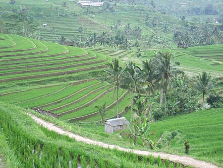 | バリ島は、タナバン中心部から北へ行ったところにある「本当に素晴らしい」という意味を持つ、その名のとおりと言っても良い過ぎではないくらい広大な何処までも続くライステラスが広がるのが、このジャティルウィのライステラスです。世界屈指の美しさと言われるこのライステラスにうんと感動なさってください。お時間をゆっくりと取らせて頂いていますので、どうぞライステラスの中をお散歩なさってくださいね。 |